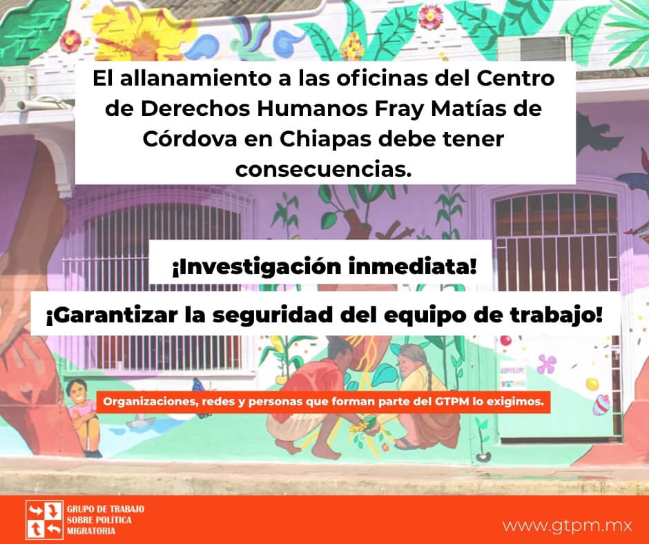 El Grupo de Trabajo sobre Política Migratoria (GTPM) manifiesta su profunda preocupación y condena los allanamientos ocurridos en las oficinas del Centro de Derechos Humanos Fray Matías de Córdova, ubicadas en Tapachula, Chiapas. Durante la madrugada del 20 de marzo, las oficinas del Centro de Derechos Humanos Fray Matías de Córdova, en Tapachula, Chiapas, fueron […]